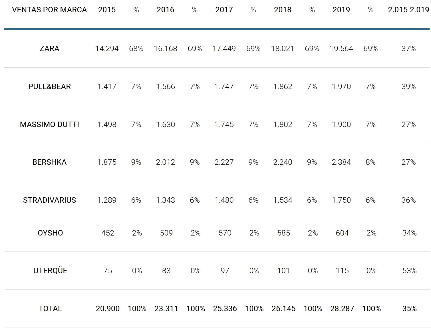 En 2019 Inditex tuvo un fuerte desempeño, con un crecimiento del 8% respecto el año anterior gracias al crecimiento en todas sus marcas comerciales.