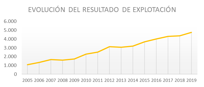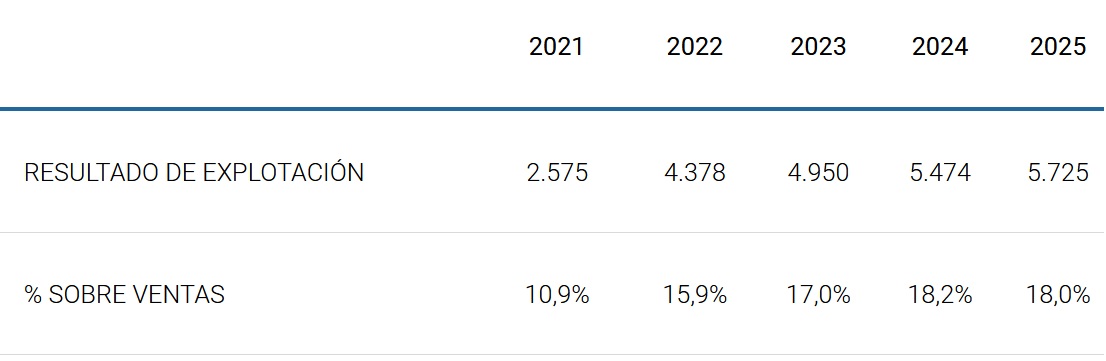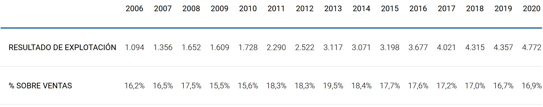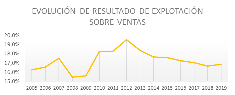 Aunque la cifra del resultado de explotación aumenta constantemente, en porcentaje sobre ventas presenta una tendencia descendente desde el año 2.014 que han logrado revertir en el último año: