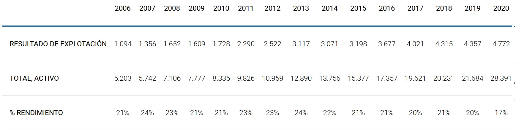 En el último año el porcentaje se reduce por el aumento considerable de su activo como consecuencia de la nueva norma contable que obliga a activar los arrendamientos de inmuebles. Sin este efecto el rendimiento del activo hubiera sido del 21,4%.