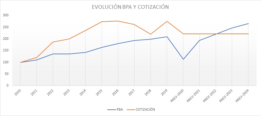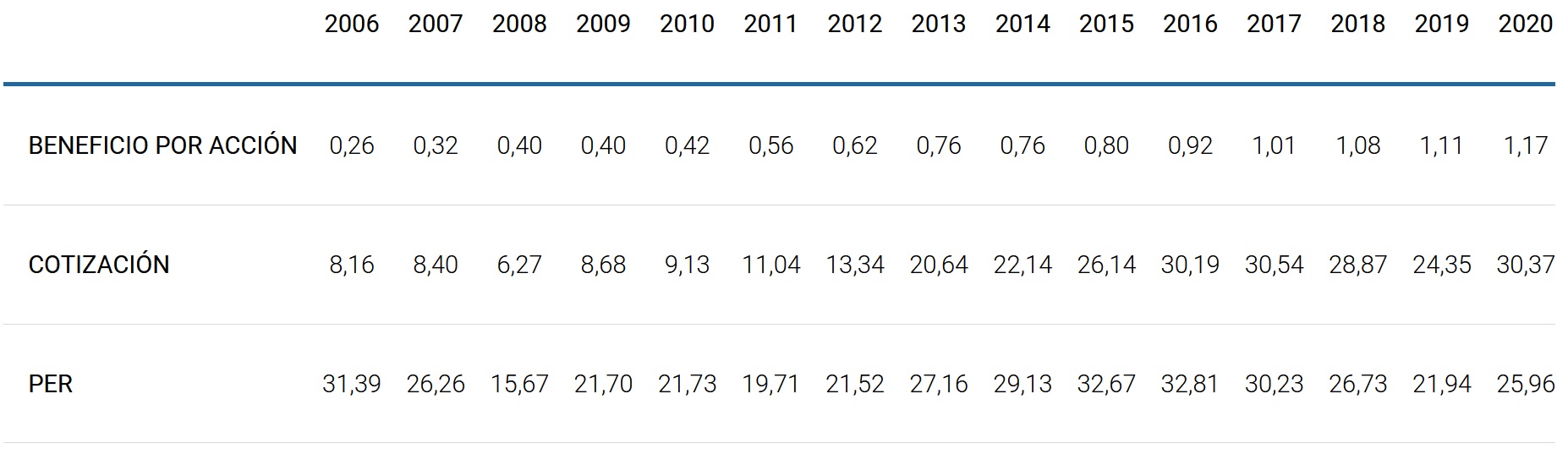 La evolución reciente del beneficio por acción, de la cotización y del PER y la prevista para los próximos años es la siguiente: