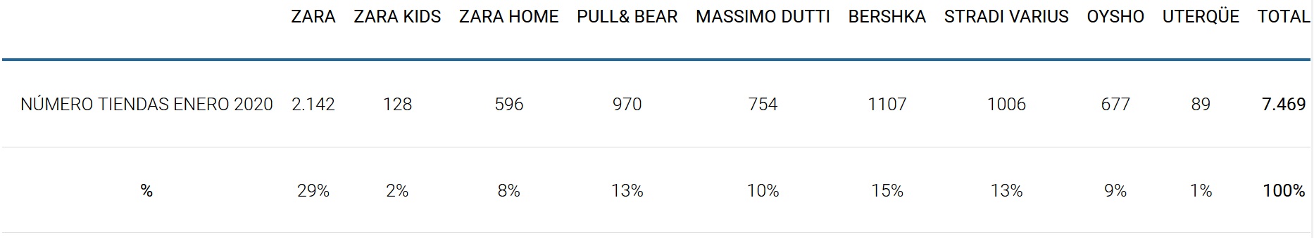 Esta actividad se desarrolla a través de ocho formatos comerciales, como son Zara, Pull&Bear, Massimo Dutti, Bershka, Stradivarius, Oysho, Zara Home y Uterqüe. Cada uno de los formatos opera con un modelo de tiendas físicas y venta online, gestionado de forma directa e integrada, salvo en el caso de ciertos mercados donde, por razones de diversa índole, la actividad se desarrolla a través de franquicias.