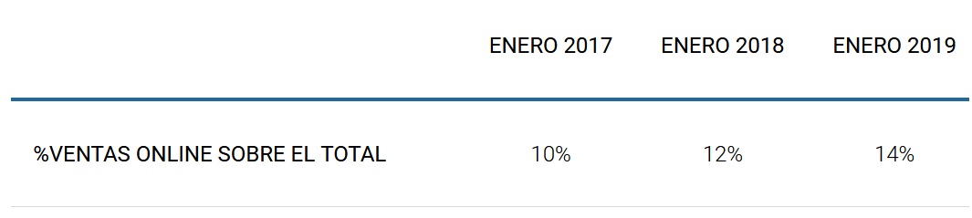 La compañía apuesta fuerte por la venta online, por lo que en la siguiente tabla podemos observar que el porcentaje sobre el total de las ventas va aumentando un 2% anualmente: