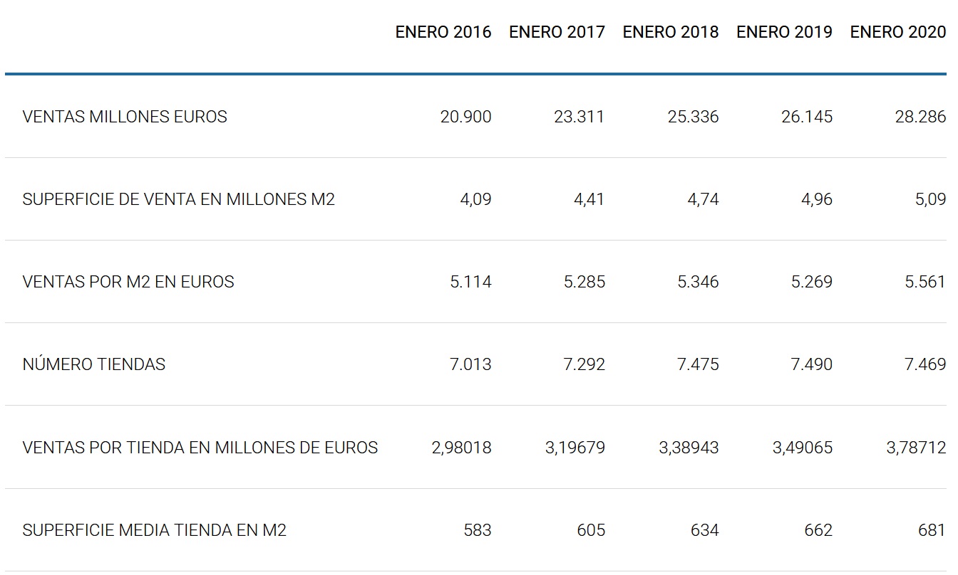El ritmo de aumento de tiendas se ha desacelerado en los últimos años, llegando en el ejercicio 2.019 - 2020 a la primera disminución en su número. Este proceso se ha visto acompañado por un aumento de la superficie media por tienda, de modo que la superficie total de venta ha continuado aumentando. Este cambio es el resultado de la nueva estrategia comercial de la empresa, consistente en potenciar su nuevo modelo de tienda con una superficie mayor (FLAGSHIPS) que sustituye al tradicional modelo de menor tamaño y también de apostar por la venta online.