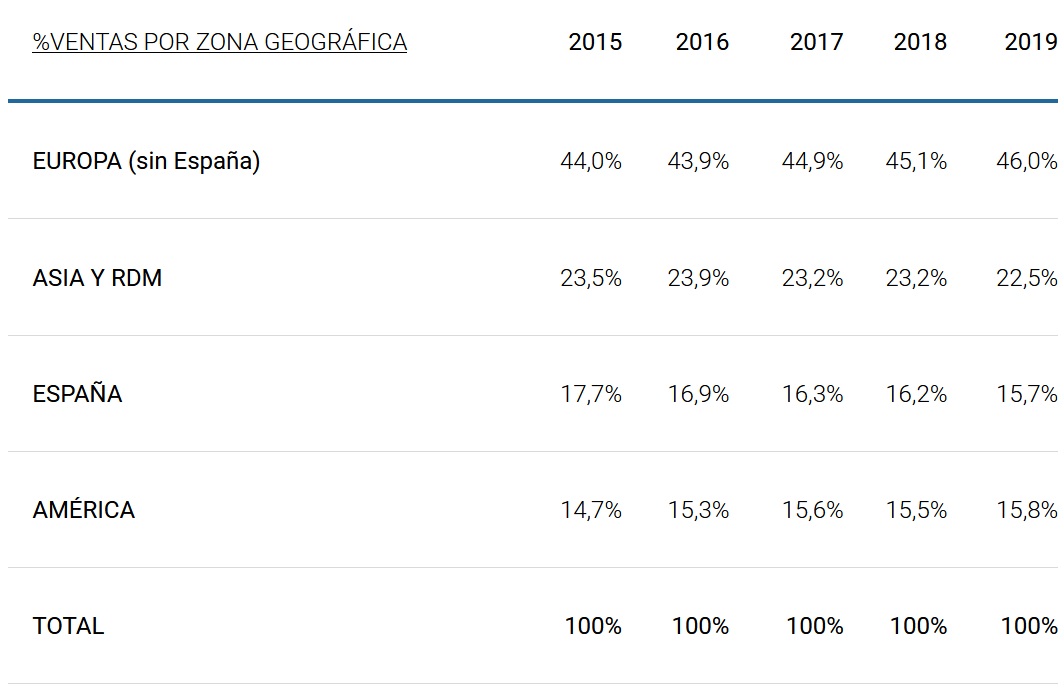 Si bien el peso de las ventas en “China y resto del mundo” se reduce en el último año, pasando del 23,2% al 22,5%.