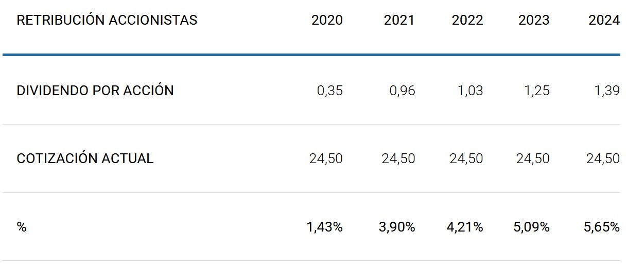 Este año la rentabilidad por dividendo se ha reducido a tan solo el 1,43%, si bien se espera que para el ejercicio 2.022-2.023 se sitúe alrededor del 5%.