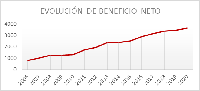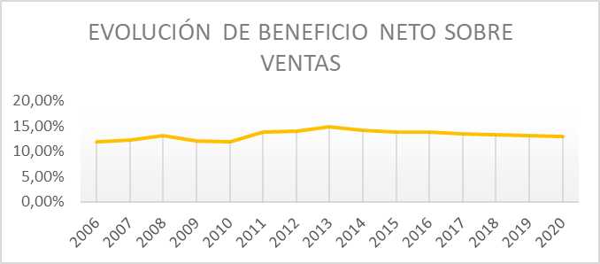 A pesar de que el importe del beneficio neto aumenta a lo largo de todo el periodo estudiado, también se obserba una tendencia a la dismunución del porcentaje del beneficio neto sobre ingresos: