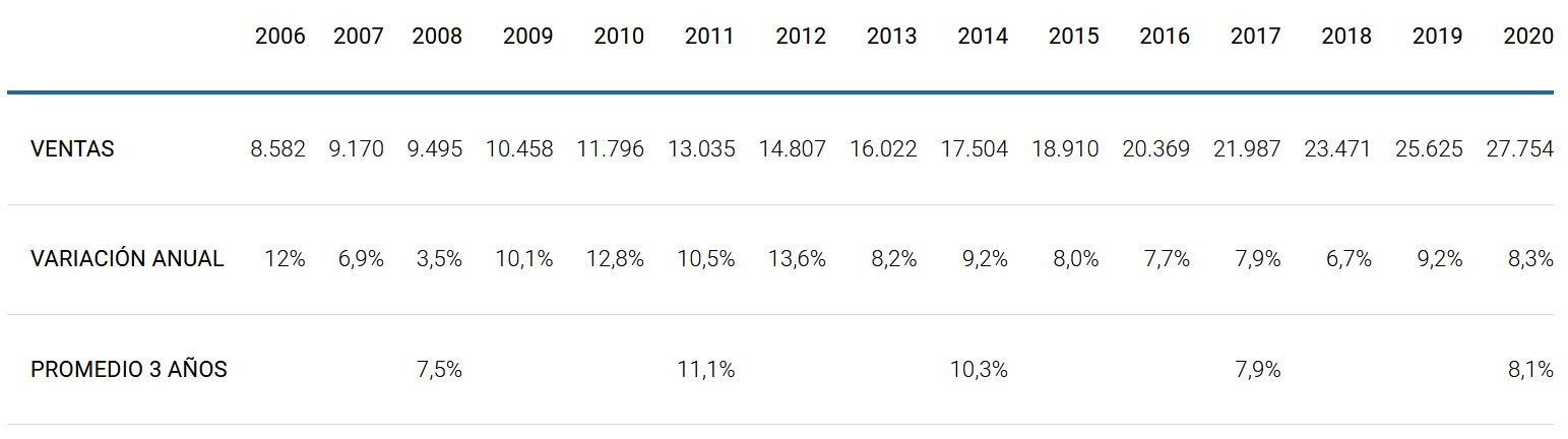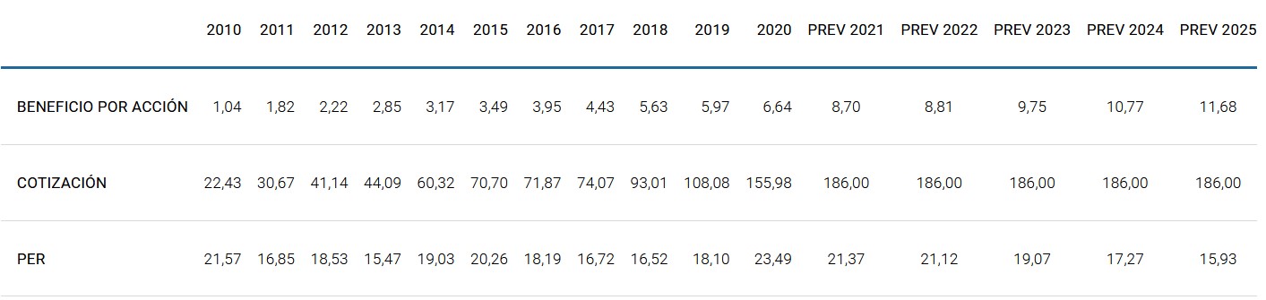 Para este ejercicio 2.020-2.021 se espera que sus ingresos aumenten el 15,4% y que el promedio de aumento de los próximos cinco años sea del 7,1%. A destacar que en el primer trimestre de este ejercicio han superado ampliamente las expectativas (+27,6%).