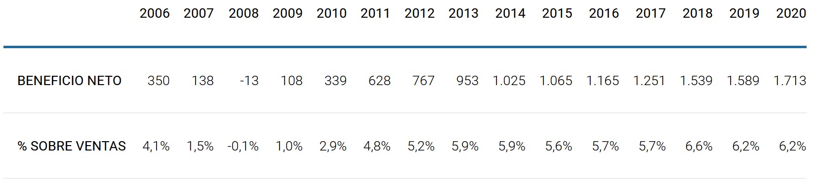 Con la excepción de los años 2.007, 2.008 Y 2.009 sus cifras de beneficios han presentado una tendencia ascendente: