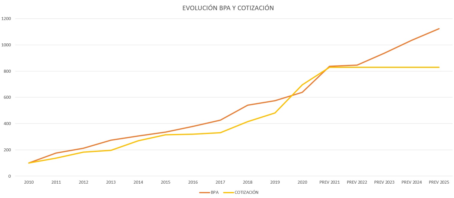 Si tomamos como base 100 los datos del año 2.010, el gráfico siguiente nos indica que la acción no está infravalorada: