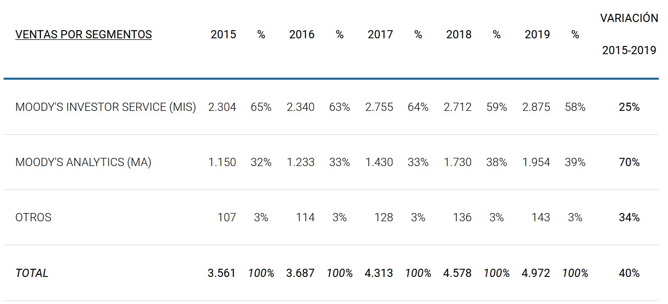 Moody’s Investor Service (MIS): el cual consiste en la operaciones de calificación de una amplia gama de valores de deuda (obligaciones corporativas y gubernamentales, finanzas estructuradas, papel comercial, etc.) de aproximadamente 36.700 emisores de más de 130 países. Este segmento de negocio es un oligopolio controlado por la compañía y sus principales competidores (S&P Global Ratings Services y Fitch Ratings).