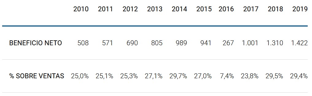 En el primer trimestre de este año el beneficio neto ha aumentado mucho tanto en importe (30,9%) como en porcentaje sobre ventas (42,7%).