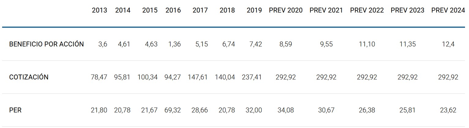 La evolución reciente del beneficio por acción, de la cotización y del PER y la prevista para los próximos años es la siguiente: