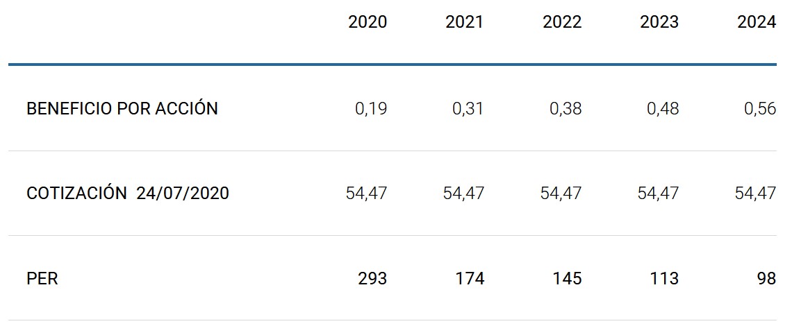 Si aceptamos como buenas las previsiones de los analistas, para conseguir una rentabilidad razonable en un horizonte temporal de cuatro años, la compañía tendría que cotizar con múltiplos muy elevados en el año 2.024: