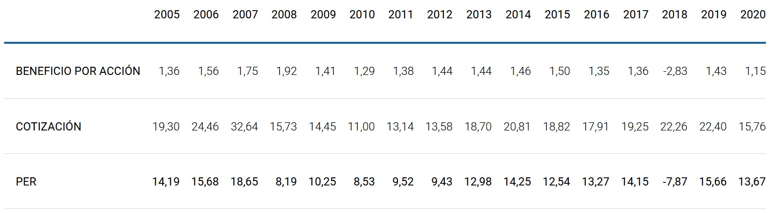 La evolución de la cotización de la acción ha sido decepcionante, lo cual se se justifica por la pésima evolución de su beneficio por acción: