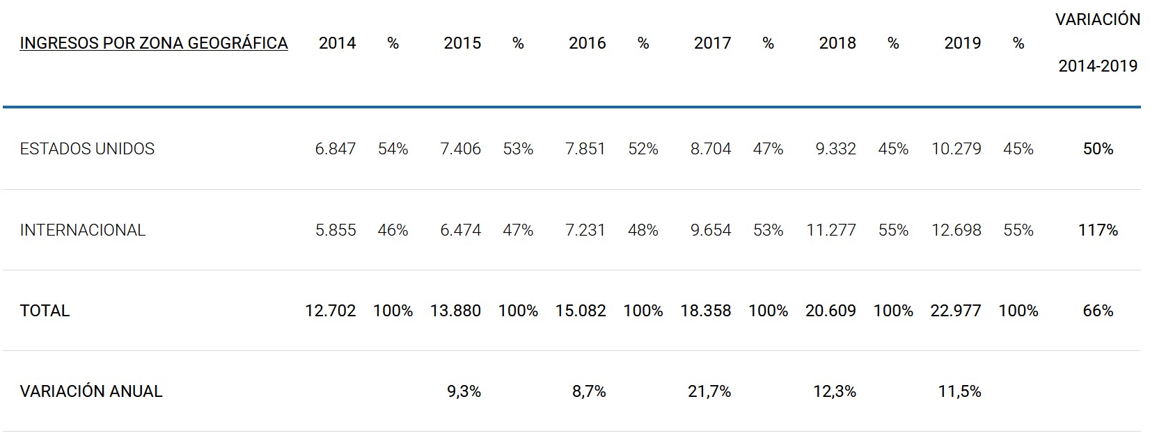 La evolución reciente de sus ingresos por zonas geográficas ha sido la siguiente: