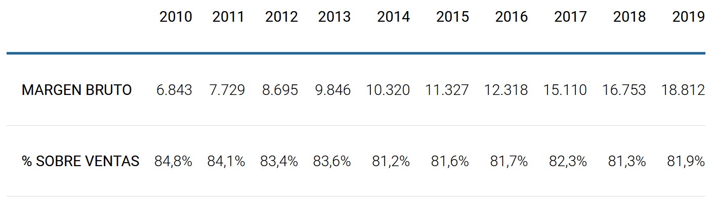 El porcentaje de margen bruto es muy elevado tal y como corresponde a una empresa del sector servicios: