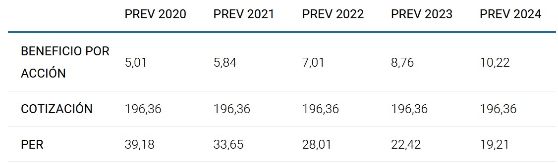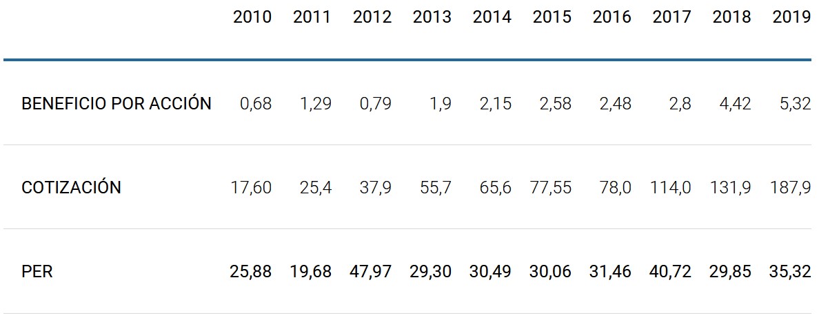 La evolución del beneficio por acción, de la cotización y del PER y la esperada para los próximos años es la siguiente: