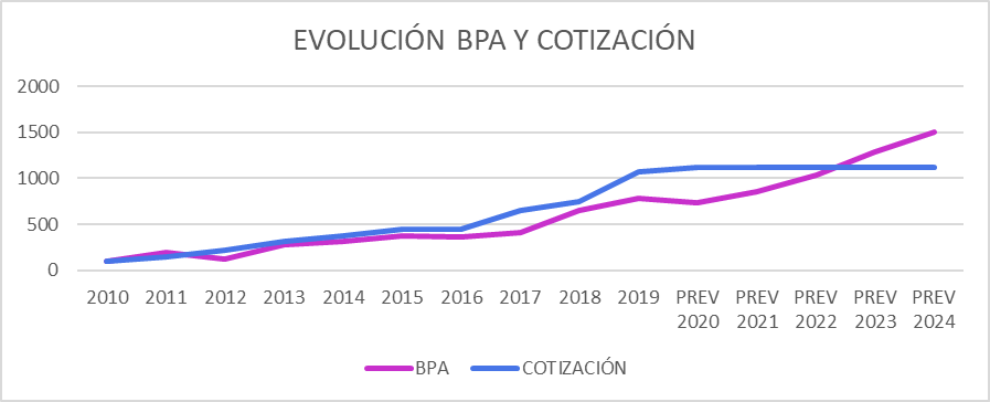 Donde podemos ver que la cotización ha aumentado por el aumento del beneficio por acción y por la expansión de múltiplos.