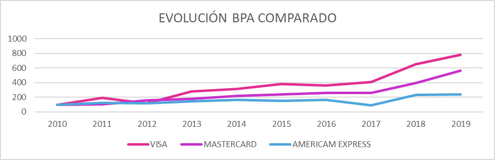 A continuación comparamos la evolución del beneficio por acción de Visa con la de sus principales competidores: