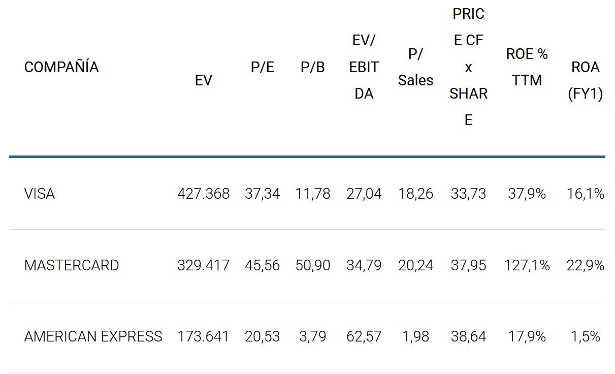 Los múltiplos de Visa comparados con los de su principales competidores son los siguientes: