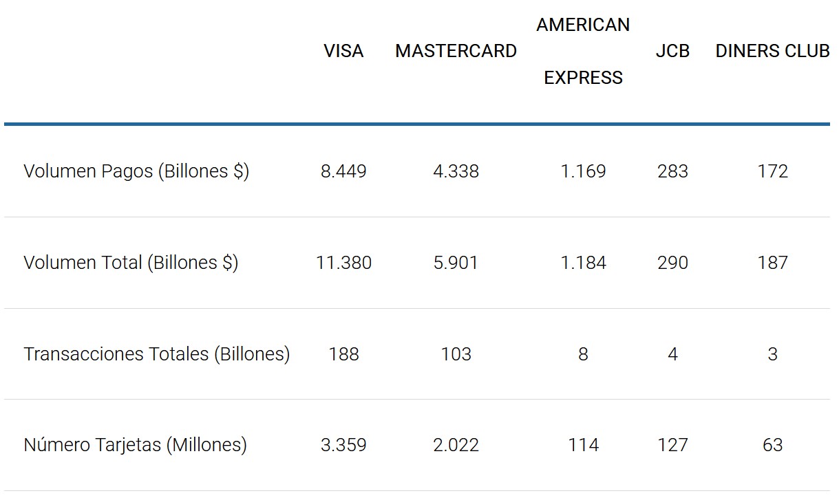 Donde podemos ver que tanto Visa como Mastercard están ganado terreno a American Express.