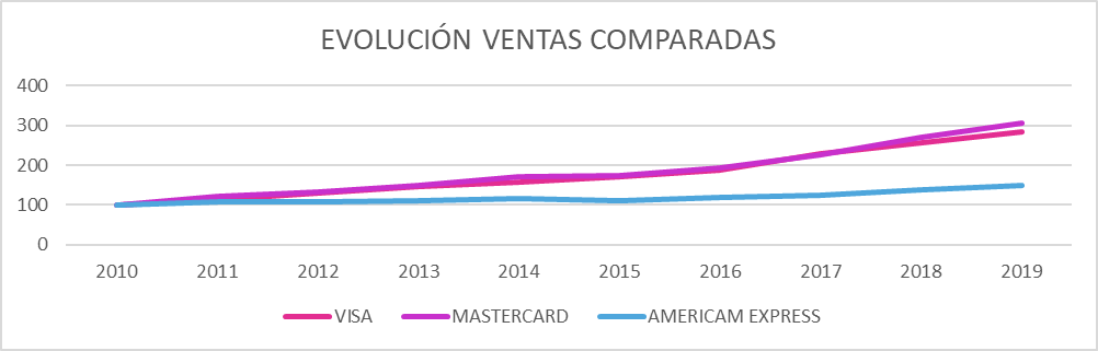 El siguiente gráfico nos permite comparar la evolución de las ventas de Visa con las de sus principales competidores: