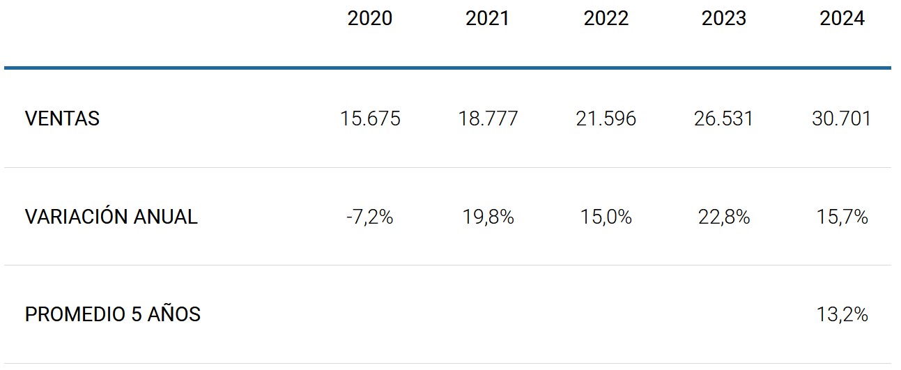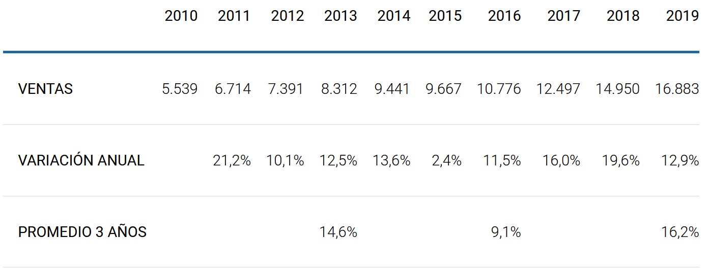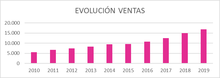 Las ventas presentan una tendencia creciente en todo el periodo estudiado: