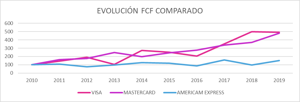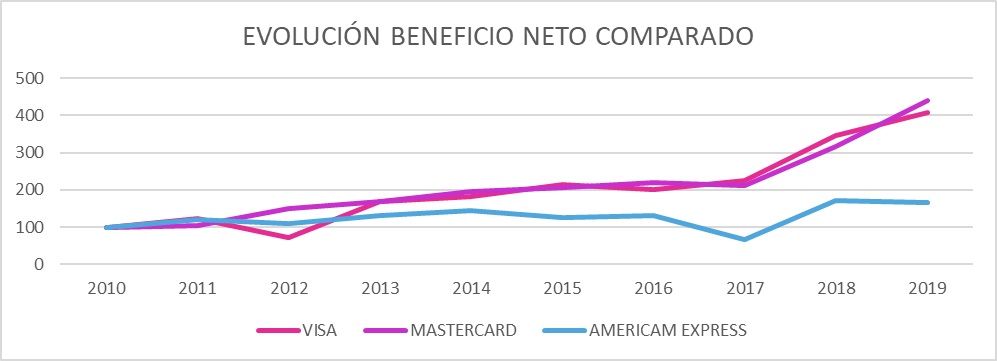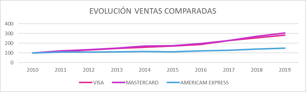 El siguiente gráfico nos permite comparar la evolución de las ventas de Visa con las de sus principales competidores: