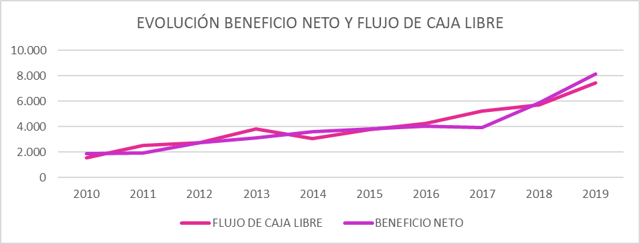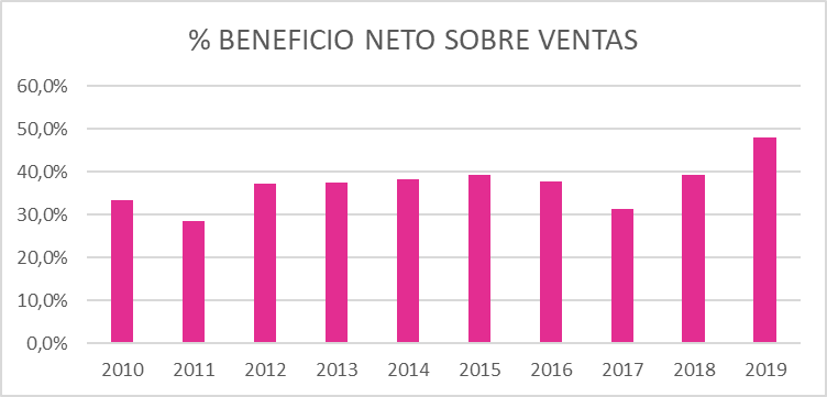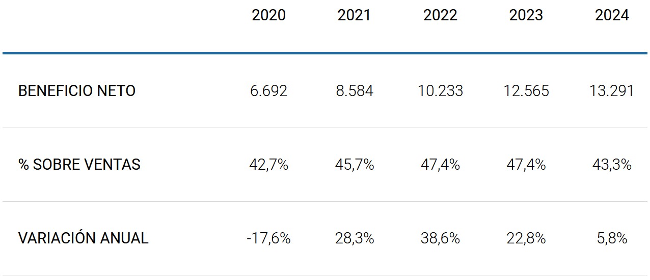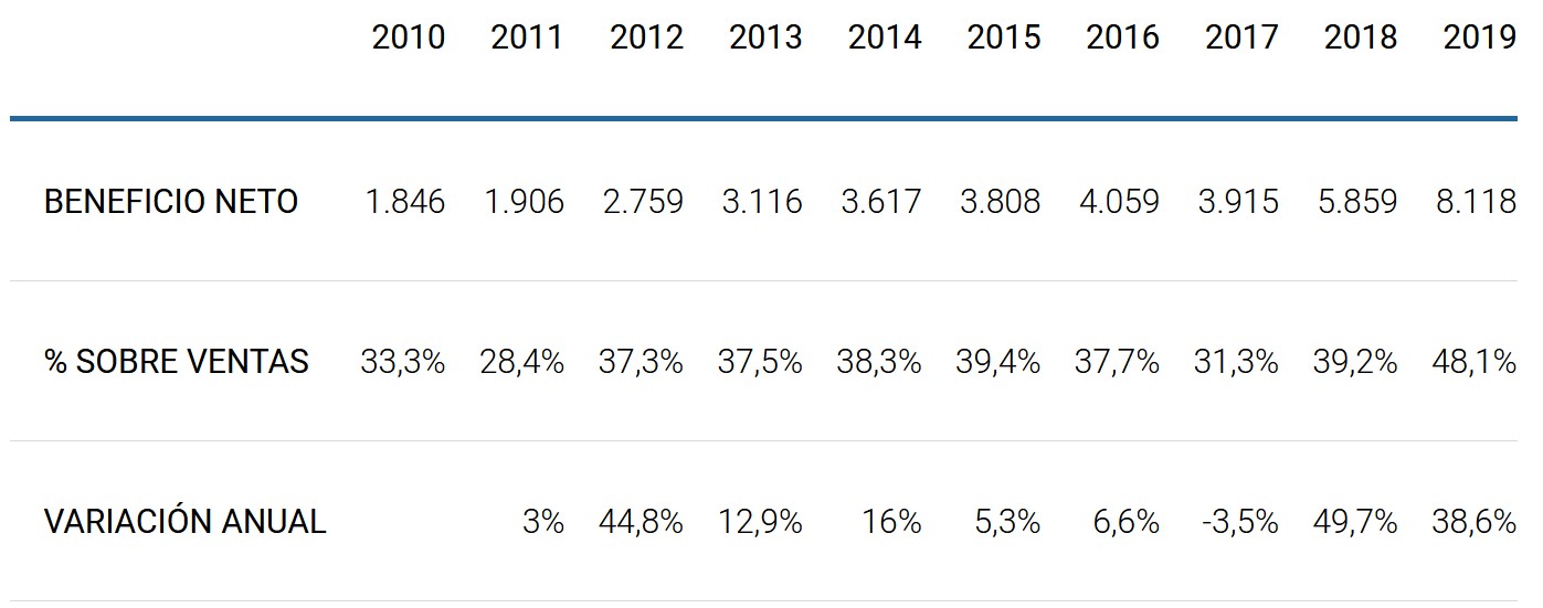 Las cifras de beneficio neto presentan una evolución muy favorable y el porcentaje sobre ventas que consiguen es muy elevado: