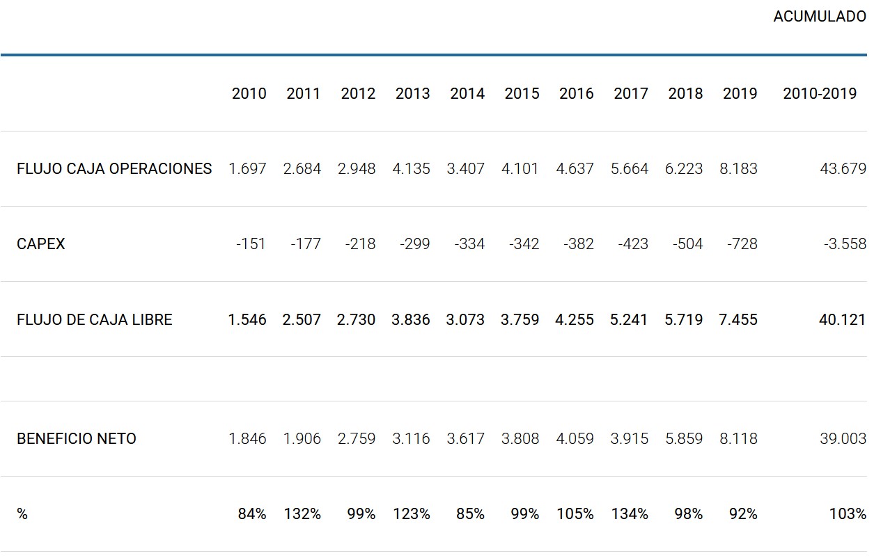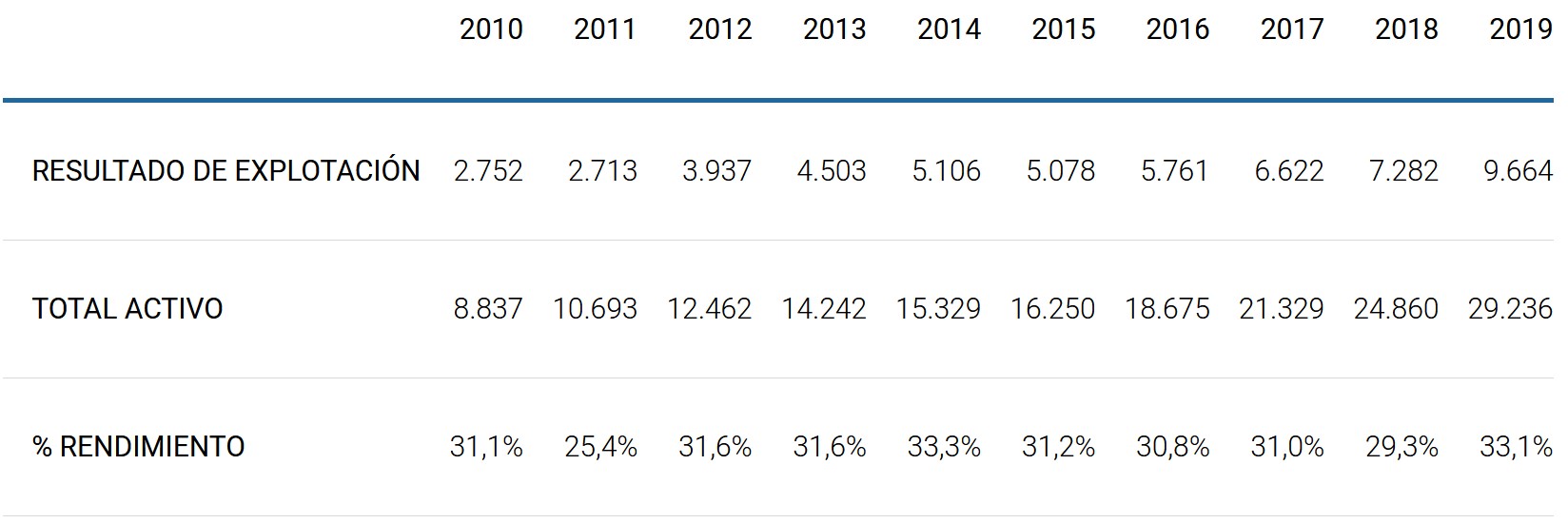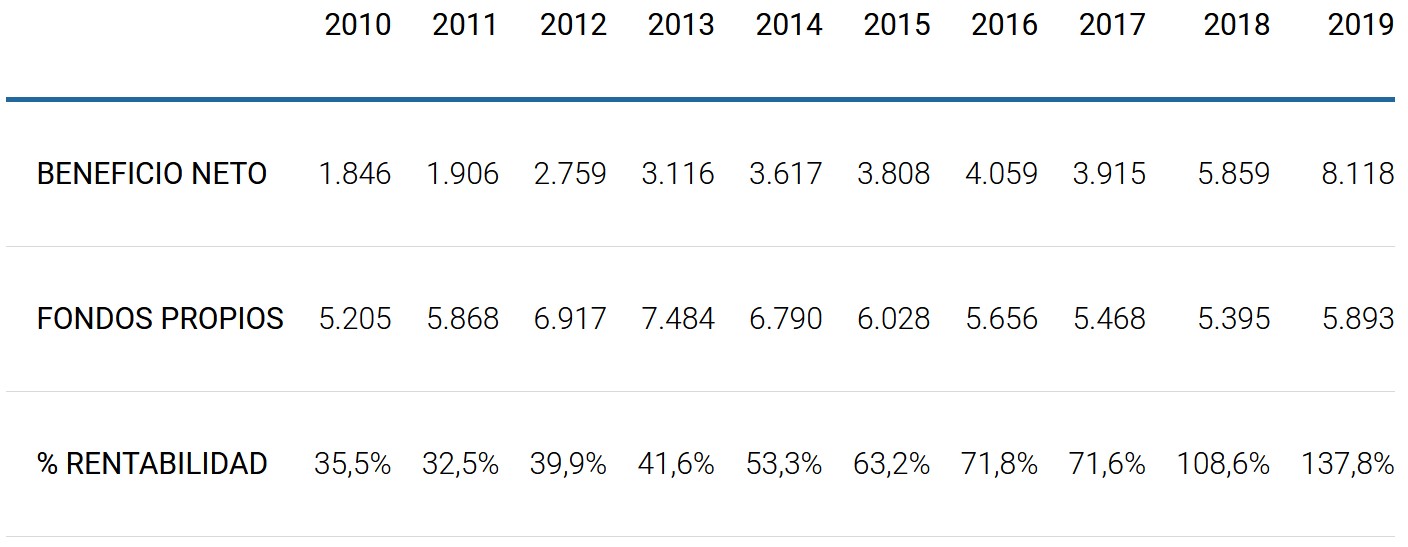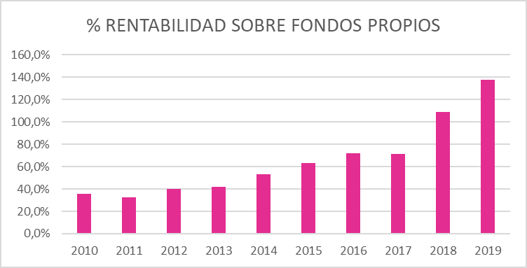 La rentabilidad que consiguen sobre sus fondos también ha mejorado mucho hasta situarse en niveles muy elevados (137,8% en el año 2.019). No obstante, el retorno sobre el capital invertido en el año 2.019 fue del 22,08%.