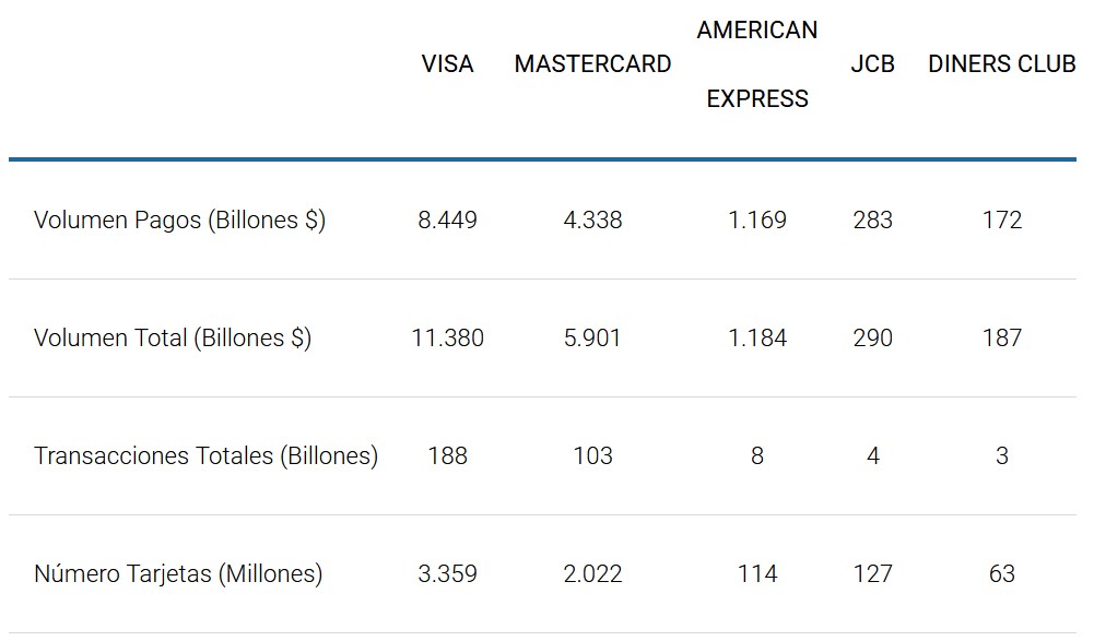 Donde podemos ver que tanto Visa como Mastercard están ganado terreno a American Express.