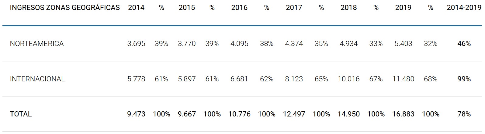 La evolución reciente de sus ingresos por zonas geográficas ha sido la siguiente:
