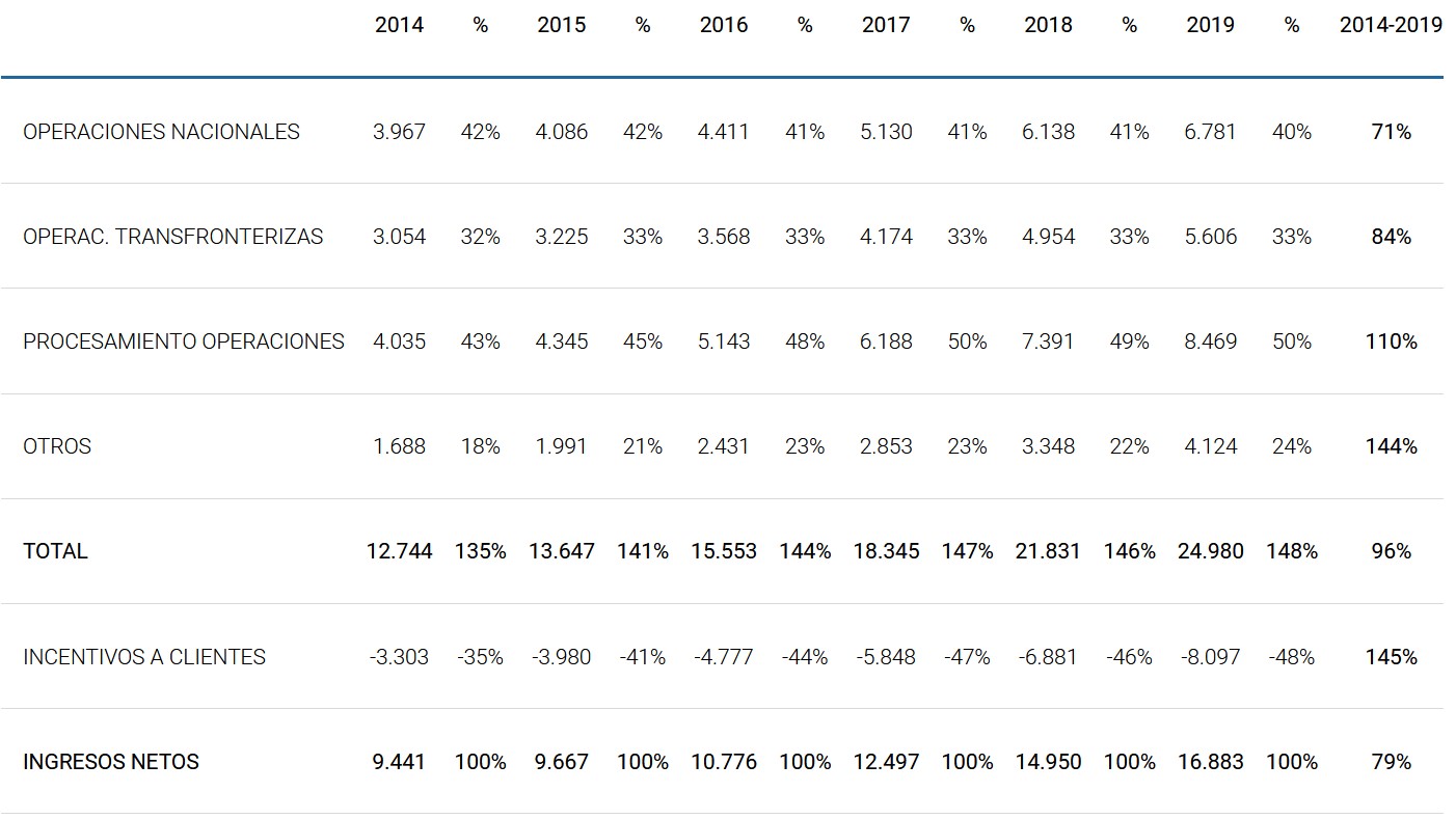 La siguiente tabla de datos del año 2.018 nos permite comparar a Mastercard con algunos de sus principales competidores: