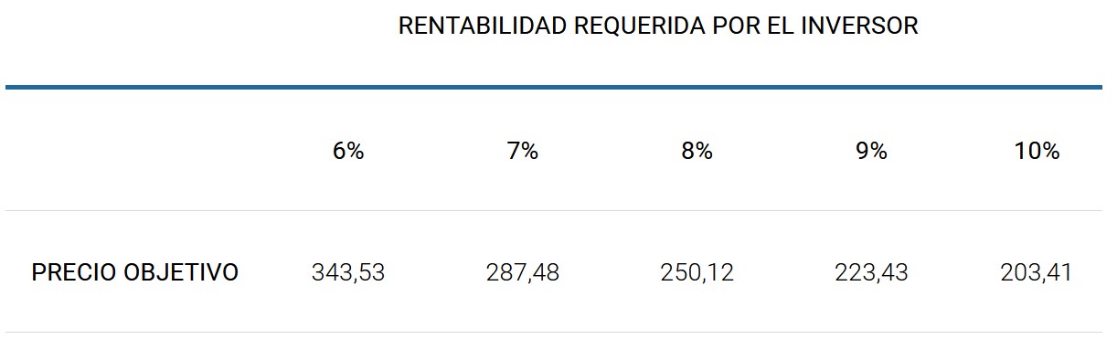 Por otra parte, mediante el descuento de flujos de caja futuros hemos calculado el precio máximo a pagar por el inversor en función de la rentabilidad mínima que desee obtener: