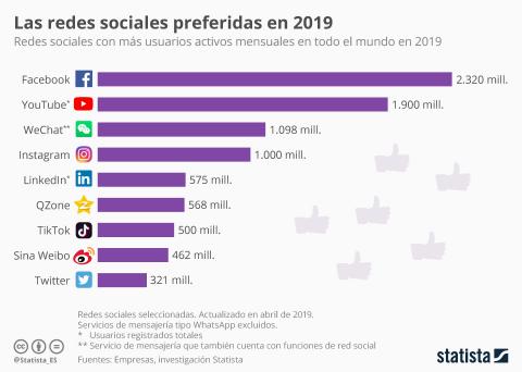 WeChat: Aplicación de mensajería instantánea y red social que también permite realizar pagos electrónicos (WeChat Pay). Es una auténtica aplicación de aplicaciones, que ofrece muchas más funciones que Facebook. En el año 2.019 tenía 1.098 millones de usuarios activos mensuales, tan solo por detrás de Facebook y Youtube.