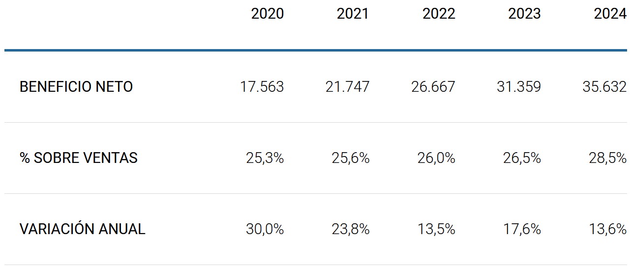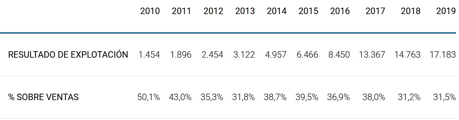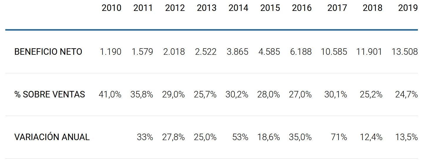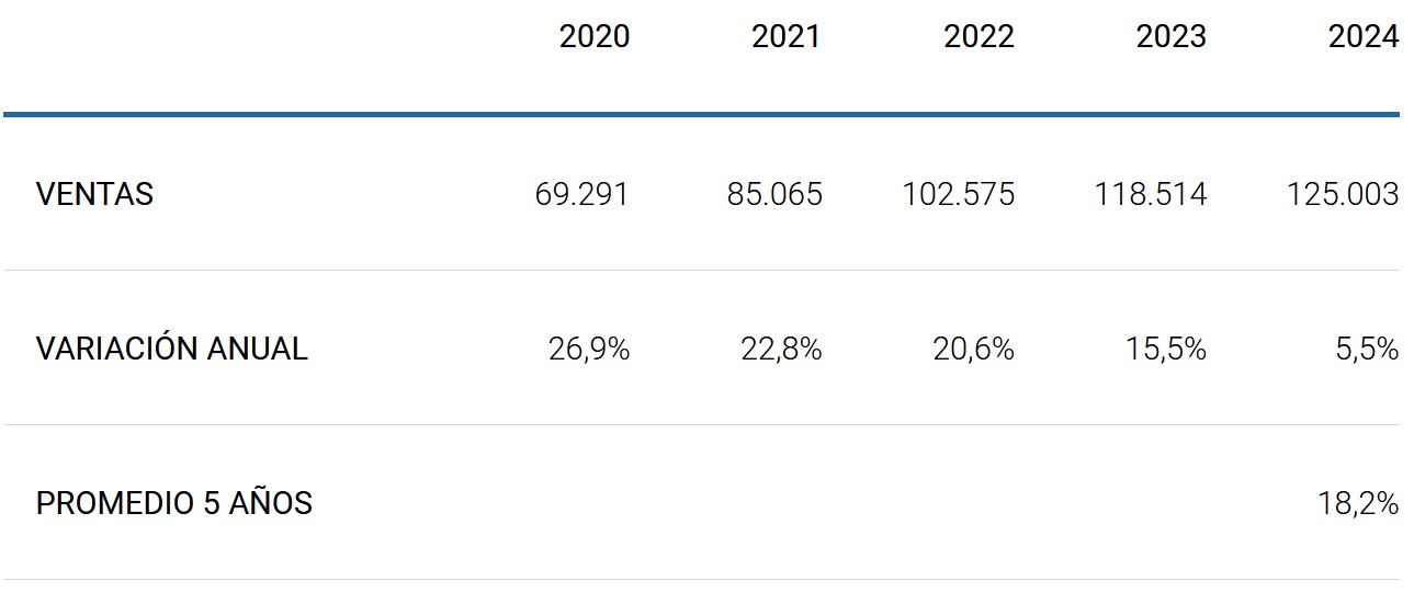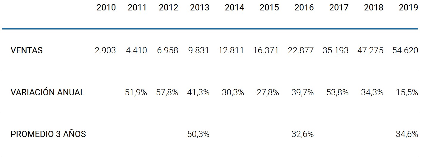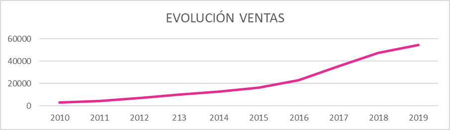Las ventas han crecido fuertemente durante todo el periodo estudiado, si bien en los últimos años se ha ralentizado su porcentaje de aumento: