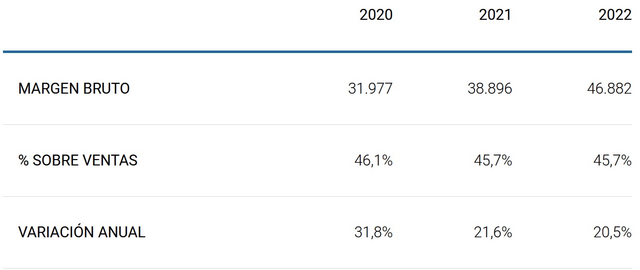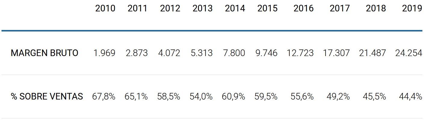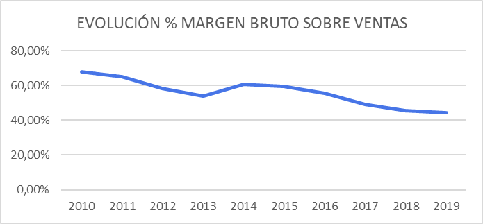 Si bien la cifra de margen bruto aumenta de forma continuada, el porcentaje sobre ventas se reduce considerablemente en el periodo estudiado: