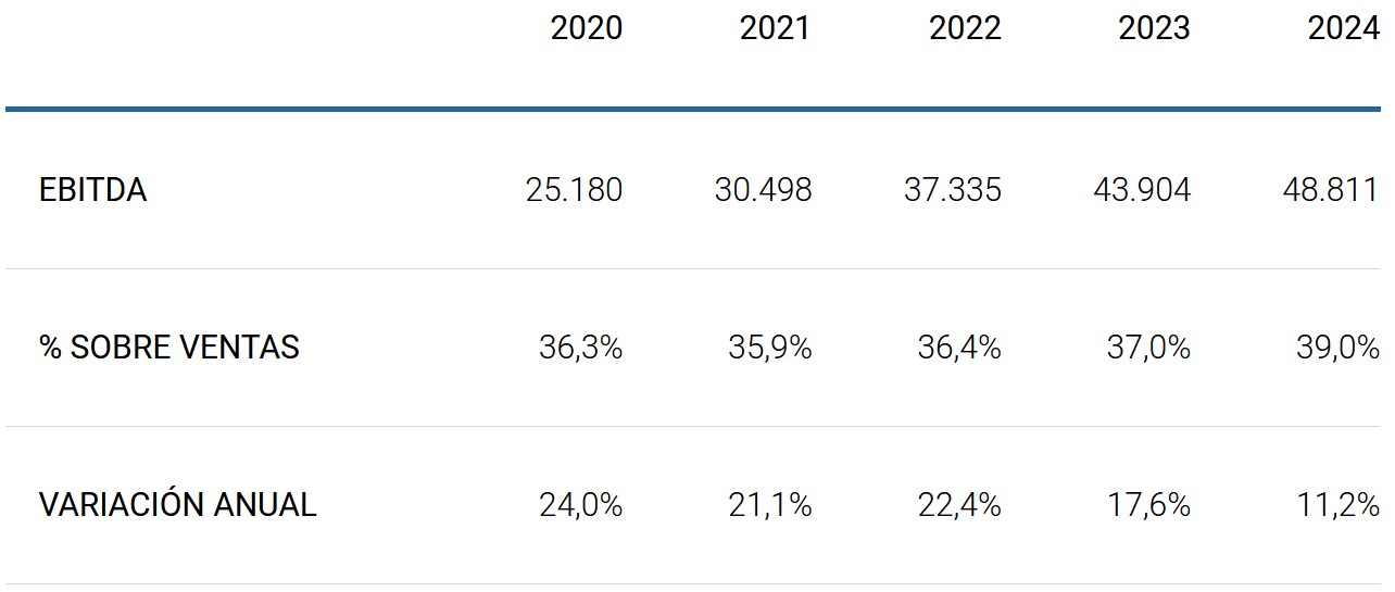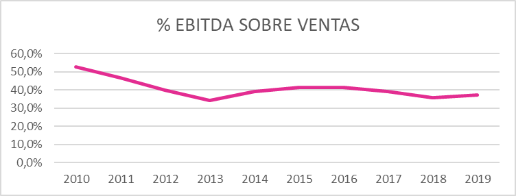 La cifra de Ebitda también aumenta a lo largo de todo el periodo estudiado, pero el porcentaje de margen Ebitda se reduce: