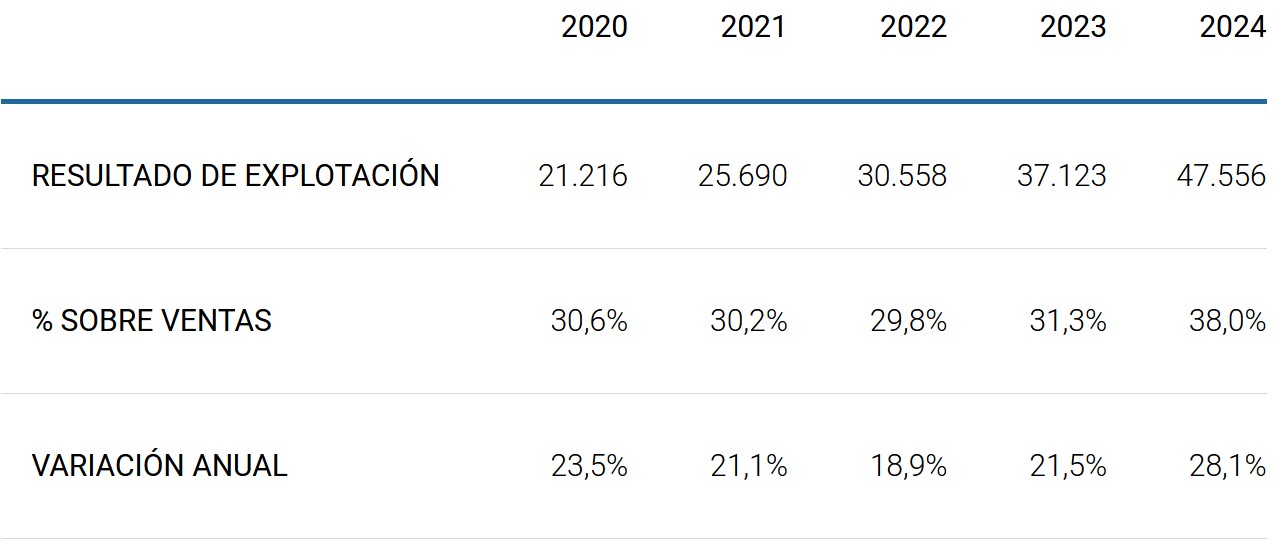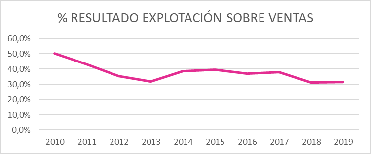 La cifra de resultado de explotación evoluciona favorablemente durante todo el periodo estudiado. En cuanto al porcentaje sobre ventas hay que destacar su tendencia claramente descendente: