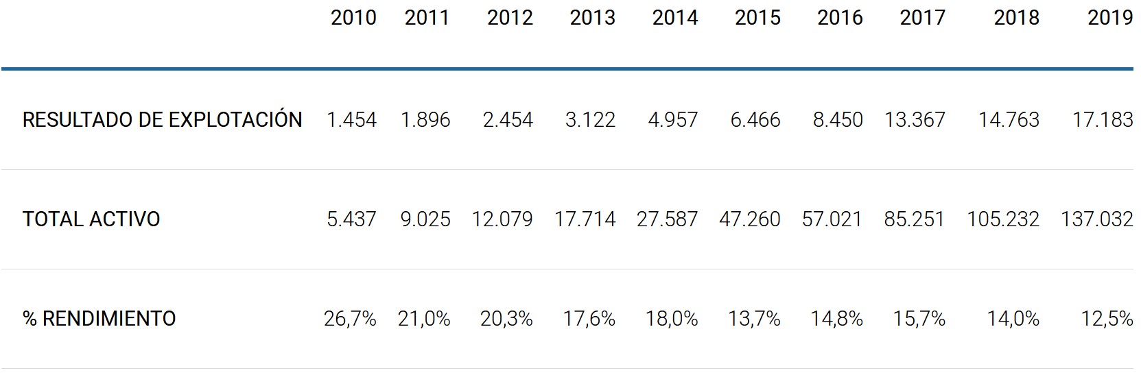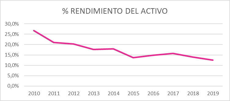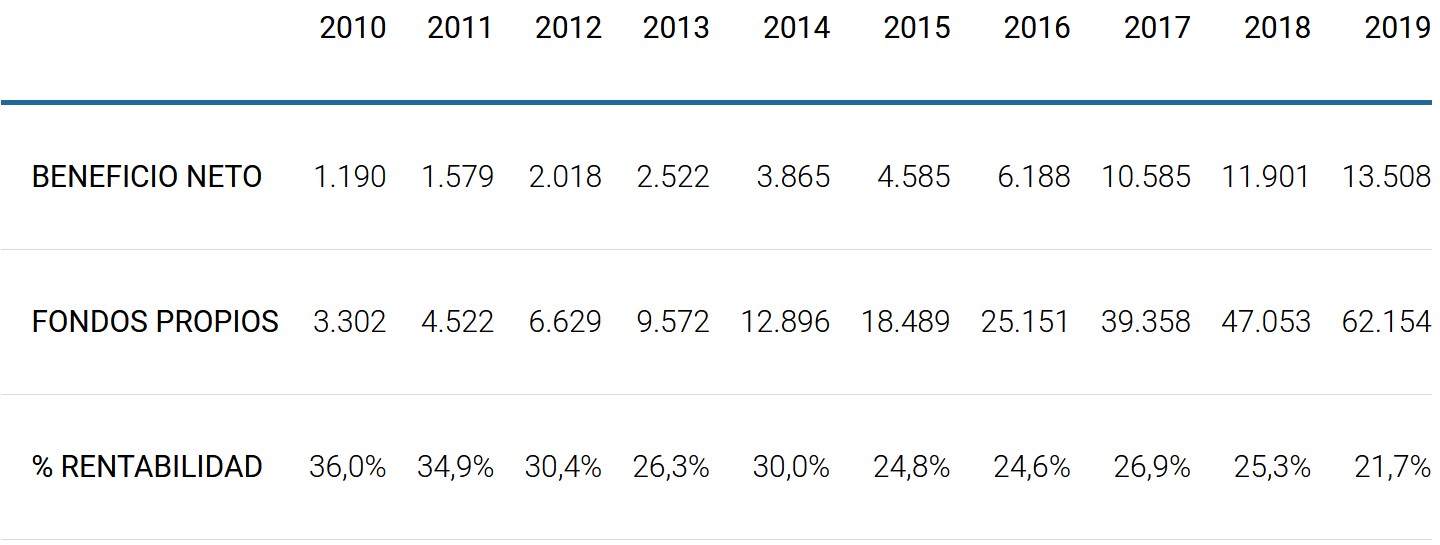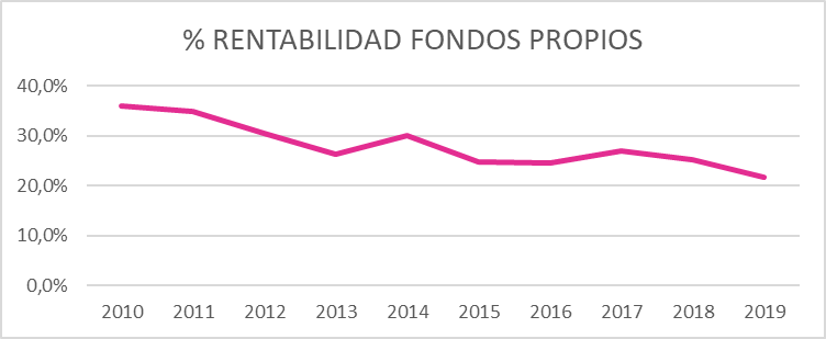 La rentabilidad sobre fondos propios también presenta una tendencia descendente, aunque continúa situándose en buenos niveles (21,7% en el año 2.019).