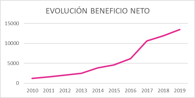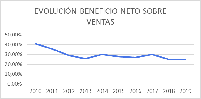 El beneficio neto ha tenido una clara tendencia ascendente durante todo el periodo estudiado. No obstante, el porcentaje de margen neto se reduce fuertemente: