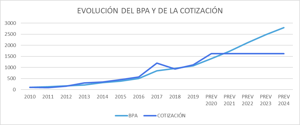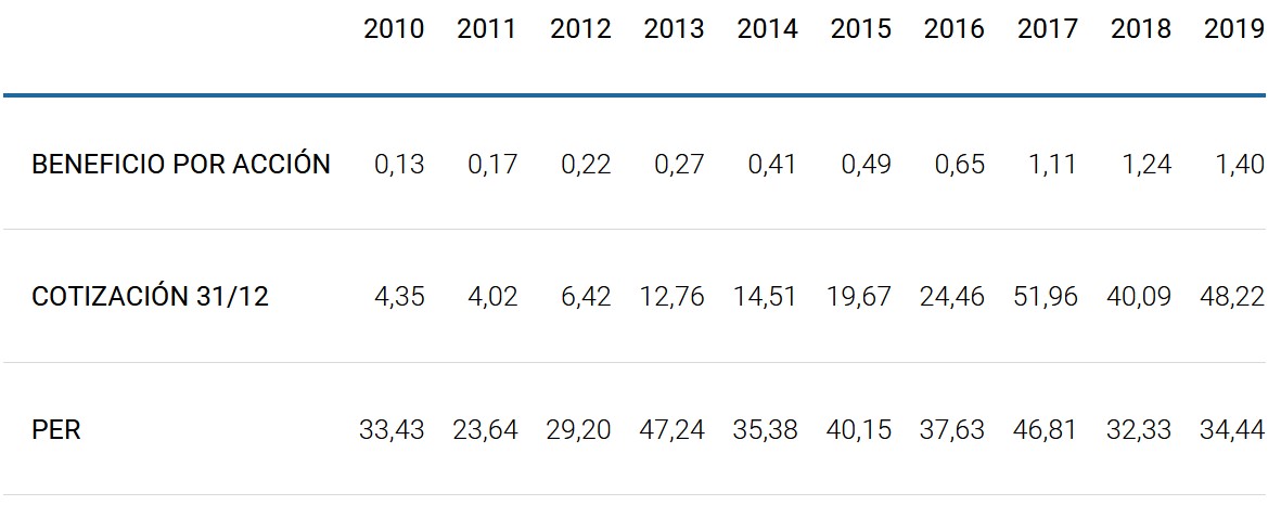 La evolución del beneficio por acción, de la cotización, el PER y la prevista para los próximos años es la siguiente:
