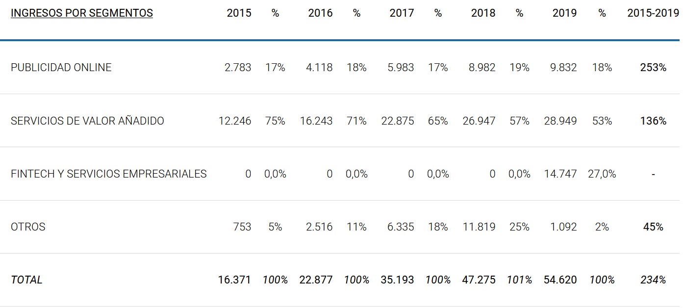 La evolución reciente de los ingresos de la empresa por segmentos ha sido la siguiente: