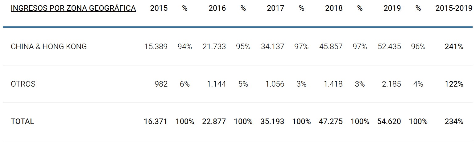 Así pues, no es de extrañar que Donald Trump haya adoptado medidas en contra de esta empresa, si bien lo más probable es que al final se apliquen exclusivamente a su aplicación WeChat y que afecten a la expansión futura de la empresa fuera de China. No obstante, como podemos ver en la siguiente tabla de datos el mercado exterior de Tencent es muy reducido: