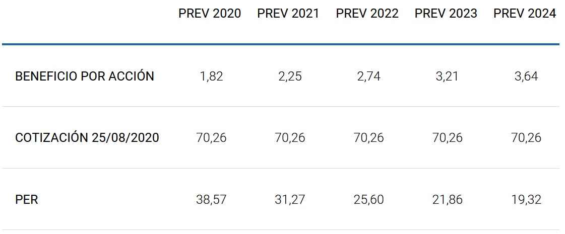 La evolución reciente del beneficio por acción, de la cotización, el PER y la prevista para los próximos años es la siguiente: