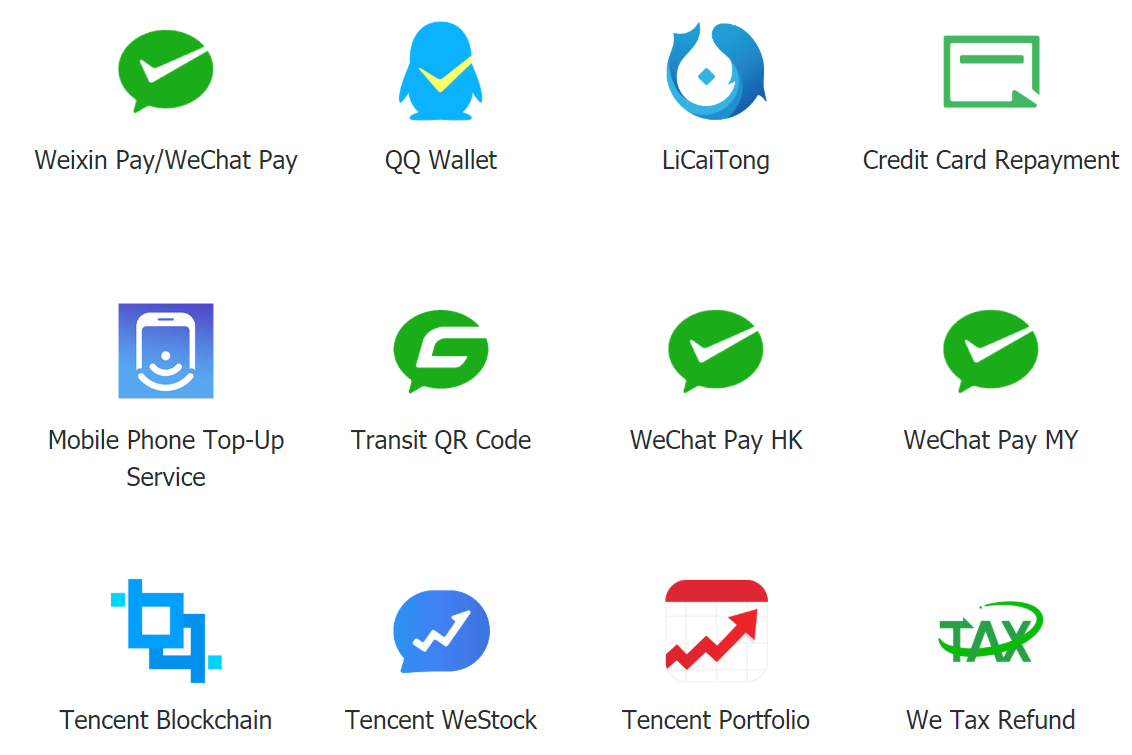 Fintech: WeChat Pay, QQ Waller, LiCailTong, Tencent Blockchain y Mobile Phone Top-Up, entre otras.