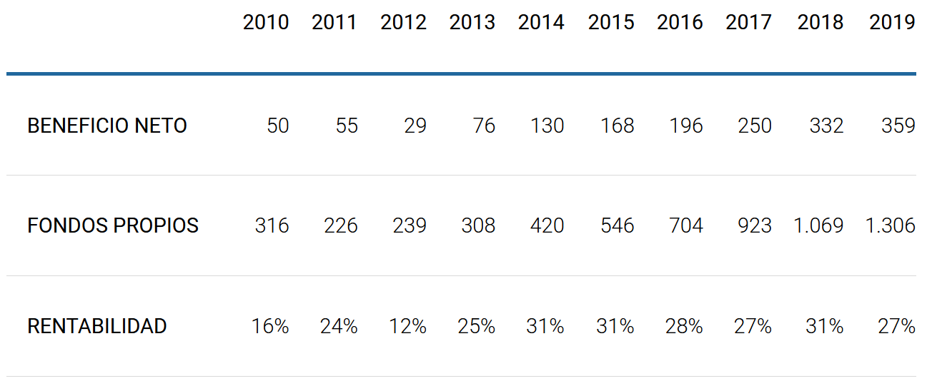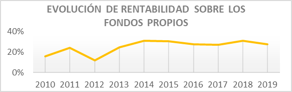 La rentabilidad sobre fondos propios que consiguen también es muy buena (27% en el año 2.019).