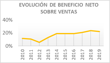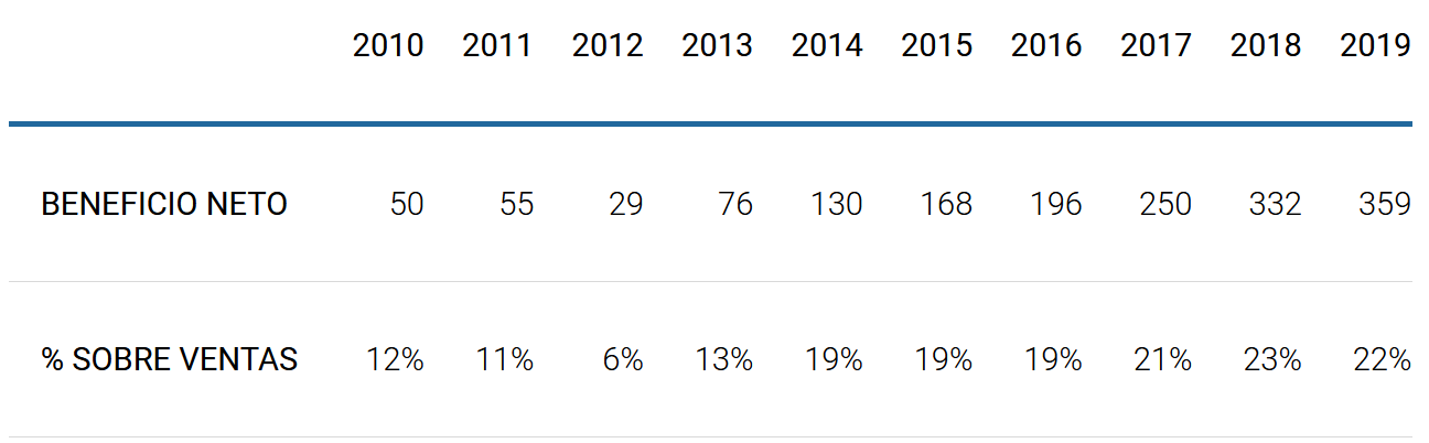 El beneficio neto también ha evolucionado muy favorablemente en todo el periodo estudiado y el porcentaje de margen neto que consiguen tan solo está al alcance de las empresas excelentes: