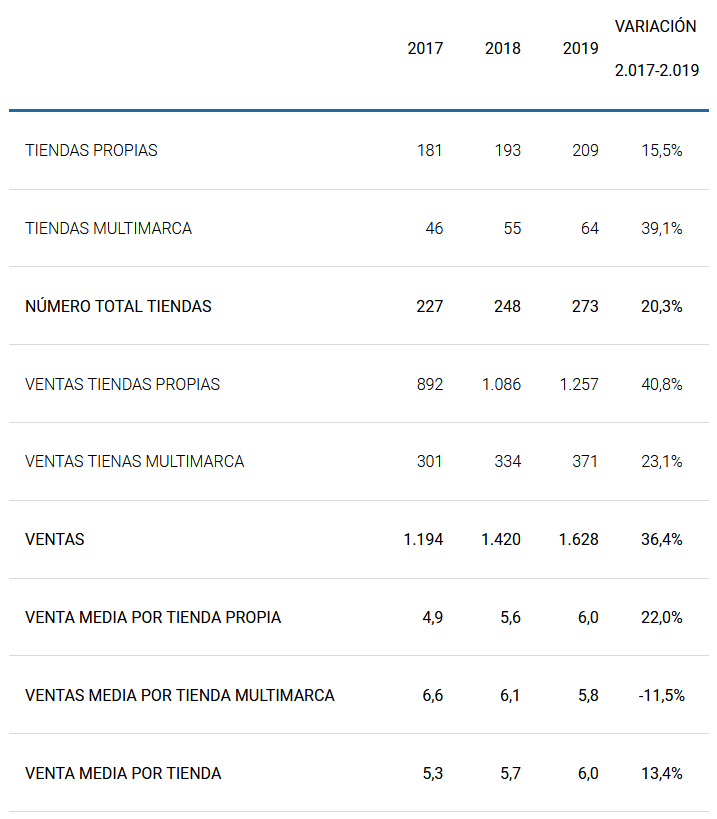 Profundizando más, vemos como en los dos últimos años sus ventas aumentan con un ritmo mayor (36,4%) que el de su número de tiendas (20,3%):