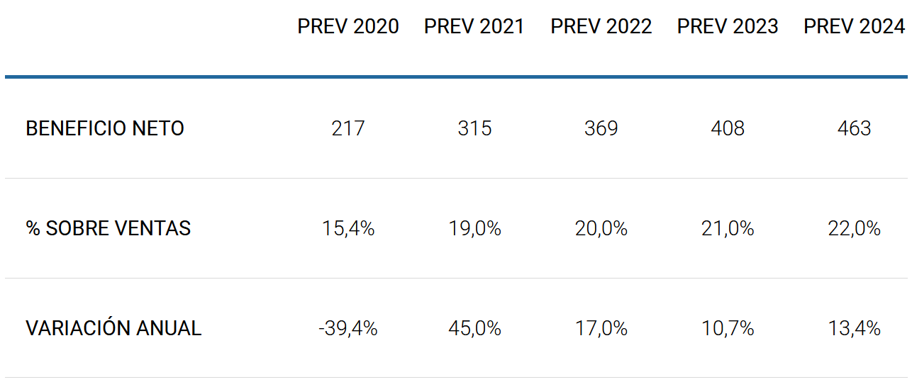 A destacar que no disponemos de las previsiones de los analistas para los años 2.023 y 2.024, por lo que las cifras de beneficio esperadas las hemos calculado nosotros.